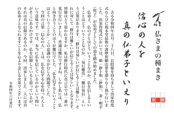 去る令和四年五月二十八日、お陰様を持ちまして出家得度式ならびに現本堂最後の護摩祈願法要を滞りなく執り行いました。出家得度式においては、娘・紗十和(紗和)、妻・明幸(牧子)が仏弟子としての道を踏み始めました。仏弟子、仏の子とはどういうことなのか。仏を信じるということはどういうことなのか。「易行難信」「難行易信」という言葉があります。「修行は易しいが信じることは難しい」それに対して「修行は難しいが信じることは易しい」となります。皆様はどう思われますか。私は修行時代に真言宗では一番の荒行を行いました。普通は難行ですよね。しかし私には、仏と向き合うことのほうが難行でした。「仏を信ずるということはどういうことか」この意識の方がむしろ問題でした。今回の言葉「信心の人」とは、仏を信ずる心を持った人という意味です。では、本当に仏を信じているのかという問いがそこにあるわけです。仏を信仰していると思っているが、それは真の信仰であるのか。今回、出家しました二人には真の仏弟子となられますことを心より念じる次第でございます。