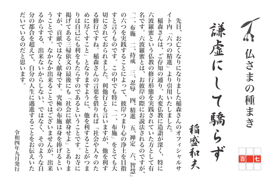 先日、お亡くなりになりました稲盛さんのオフィシャルサイト内「六つの精進」より引用いたしました。稲盛さんは、ご存知の通り、大変仏教に造詣が深く、特に六波羅蜜という仏教の修行形態を実践されていた方として有名です。六波羅蜜とは、お彼岸の際にお説法されるのですが、「一、布施 二、持戒 三、忍辱 四、精進 五、禅定 六、智慧」の六つを実践することによって、彼岸つまり心の浄土を目指すと言うものです。この中でも特に「一、布施」をとても大切にされておられました。利他行とも言いますが、他を利するために尽くすこと」となりますように、他を利することがつまりは自己にも利をもたらすのであるということです。お寺に掲げてある三帰依文の最後にも「社会に献身せよ」とありますが、貢献ではなく献身です。究極の布施は身を捧げるということ。なかなか出来ることではございませんが、出来るからする、出来ないからしない、ではなく、そのような自分の都合を超えて、自分の人生に邁進することをお伝えいただいているのだと思います。
