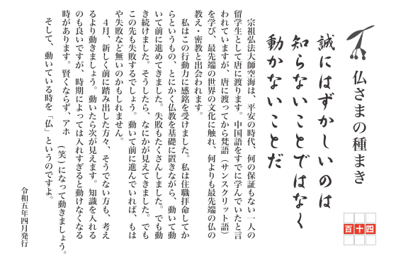 宗祖弘法大師空海は、平安の時代、何の保証もない一人の留学生として唐に渡ります。中国語をすでに学んでいたと言われていますが、唐に渡ってから梵語(サンスクリット語)を学び、最先端の世界の文化に触れ、何よりも最先端の仏の教え・密教と出会われます。私はこの行動力に感銘を受けました。私は住職拝命してからというもの、とにかく仏教を基礎に置きながら、動いて動いて前に進めてきました。失敗もたくさんしました。でも動き続けました。そうしたら、なにかが見えてきました。でもこの先も失敗するでしょう。動いて前に進んでいれば、もはや失敗など無いのかもしれません。4月、新しく前に踏み出した方々、そうでない方も、考えるより動きましょう。動いたら次が見えます。知識を入れるのも良いですが、時期によっては入れすぎると動けなくなる時があります。賢くならず、アホ(笑)になって動きましょう。そして、動いている時を「仏」というのですよ。