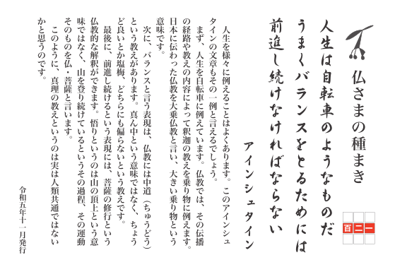 人生を様々に例えることはよくあります。このアインシュタインの文章もその一例と言えるでしょう。まず、人生を自転車に例えています。仏教では、その伝播の経路や教えの内容によって釈迦の教えを乗り物に例えます。日本に伝わった仏教を大乗仏教と言い、大きい乗り物という意味です。次に、バランスと言う表現は、仏教には中道(ちゅうどう)という教えがあります。真ん中という意味ではなく、ちょうど良いとか塩梅、どちらにも偏らないという教えです。最後に、前進し続けるという表現には、菩薩の修行という仏教的な解釈ができます。悟りというのは山の頂上という意味ではなく、山を登り続けているというその過程、その運動そのものを仏・菩薩と言います。このように、真理の教えというのは実は人類共通ではないかと思うのです。