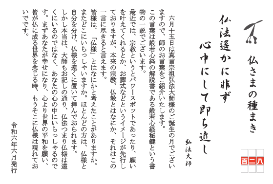六月十五日は真言宗祖弘法大師様のご誕生の月でございますので、師のお言葉をご紹介いたします。この言葉は般若心経の解説書である般若心経秘鍵という書物の一説でございます。最近では、宗教というとパワースポットであったり、願いを叶えてくれるとか、お葬式などというイメージが先行しておりますが、本来の宗教、仏教とはなにか、それはこの一言に尽きると言えます。皆様は、「仏様」とはなにかと考えたことがありますか。またどこにいらっしゃいますか。ほとんどの方は、仏様と自分を分け、仏様を遠くに置いて拝んでおられます。しかし本当は、大師もお記しの通り、仏法つまり仏様は遠くにいるのではなく、あなたの心の中にいらっしゃるのです。まずあなたが幸せになり、心より世界の平和を願い、皆が仏に成る世界を念じる時、もうそこに仏様は現れておいでです。