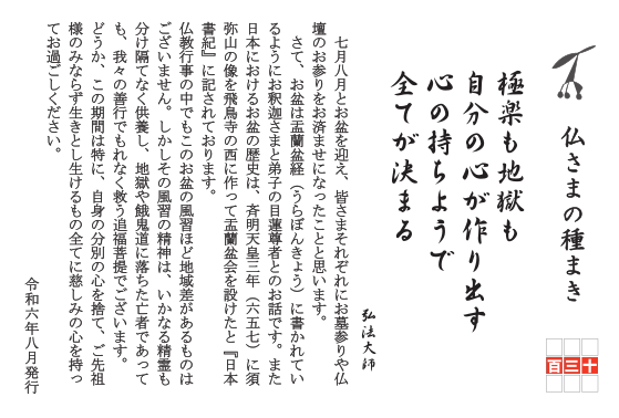 七月八月とお盆を迎え、皆さまそれぞれにお墓参りや仏壇のお参りをお済ませになったことと思います。さて、お盆は盂蘭盆経(うらぼんきょう)に書かれているようにお釈迦さまと弟子の目連尊者とのお話です。また日本におけるお盆の歴史は、斉明天皇三年(六五七)に須弥山の像を飛鳥寺の西に作って盂蘭盆会を設けたと『日本書紀』に記されております。仏教行事の中でもこのお盆の風習ほど地域差があるものはございません。しかしその風習の精神は、いかなる精霊も分け隔てなく供養し、地獄や餓鬼道に落ちた亡者であっても、我々の善行でもれなく救う追福菩提でございます。どうか、この期間は特に、自身の分別の心を捨て、ご先祖様のみならず生きとし生けるもの全てに慈しみの心を持ってお過ごしください。