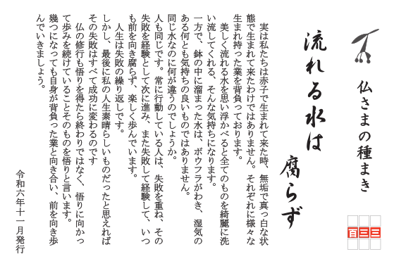 実は私たちは赤子で生まれて来た時、無垢で真っ白な状態で生まれて来たわけではありません。それぞれに様々な生まれ持った業を背負っております。美しく流れる水を思い浮かべると全てのものを綺麗に洗い流してくれる、そんな気持ちになります。一方で、鉢の中に溜まった水は、ボウフラがわき、湿気のある何とも気持ちの良いものではありません。同じ水なのに何が違うのでしょうか。人も同じです。常に行動している人は、失敗を重ね、その失敗を経験として次に進み、また失敗して経験して、いつも前を向き腐らず、楽しく歩んでいます。人生は失敗の繰り返しです。しかし、最後に私の人生素晴らしいものだったと思えればその失敗はすべて成功に変わるのです仏の修行も悟りを得たら終わりではなく、悟りに向かって歩みを続けていることそのものを悟りと言います。幾つになっても自身が背負った業と向き合い、前を向き歩んでいきましょう。