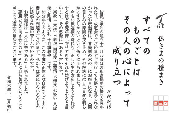皆様ご承知の通り十二月八日はお釈迦様がお悟りを開かれた日、成道会でございます。苦行しても悟りを得られなかったお釈迦様は、菩提樹の木の下にお座りになり、人間の苦しみの原因を突き止め、その解決には自己自身を明らかにするしかないという悟りに至られました。今もお釈迦様の時代も、正しい生き方をしようとすればするほど悪魔が押し寄せてきてそれを妨げようとすると言います。その悪魔は十あると言います。一楽欲 二不快 三飢渇 四渇愛 五懶惰 六恐怖畏 七疑い 八虚栄と剛情 九名利 十自讃毀他 です。お分かりのように、この悪魔の正体とは自身の心の中に潜む心の問題でございます。私たちは常にいろいろなものに誘惑され迷い苦しんでいるのです。お釈迦様は「人生は苦である」と悟られました。「悪魔とどう向き合うのか」それに自ら気付くということ がこの成道会の意味でございます。