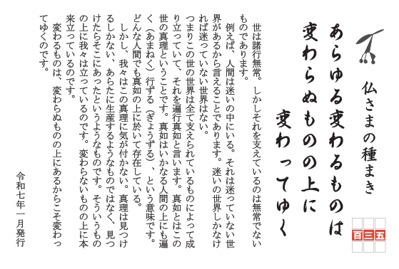 世は諸行無常。しかしそれを支えているのは無常でないものであります。例えば、人間は迷いの中にいる。それは迷っていない世界があるから言えることであります。迷いの世界しかなければ迷っていない世界はない。つまりこの世の世界は全て支えられているものによって成り立っていて、それを遍行真如と言います。真如とはこの世の真理ということです。真如はいかなる人間の上にも遍く(あまねく)行ずる(ぎょうずる)、という意味です。どんな人間でも真如の上に於いて存在している。しかし、我々はこの真理に気が付かない。真理は見つけるしかない、あらたに生産するようなものではなく、見つけたらそこにあったというようなものです。そういうものの上に我々は立っているのです。変わらないものの上に本当に変わるものは、変わらぬものの上にあるからこそ変わってゆくのです。