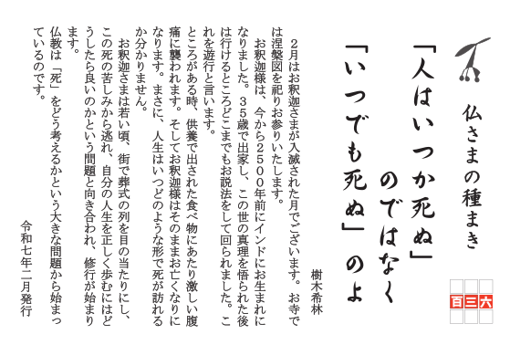 2月はお釈迦さまが入滅された月でございます。お寺では涅槃図を祀りお参りいたします。お釈迦様は、今から2500年前にインドにお生まれになりました。35歳で出家し、この世の真理を悟られた後は行けるところどこまでもお説法をして回られました。これを遊行と言います。ところがある時、供養で出された食べ物にあたり激しい腹痛に襲われます。そしてお釈迦様はそのままお亡くなりになります。まさに、人生はいつどのような形で死が訪れるか分かりません。お釈迦さまは若い頃、街で葬式の列を目の当たりにし、この死の苦しみから逃れ、自分の人生を正しく歩むにはどうしたら良いのかという問題と向き合われ、修行が始まります。仏教は「死」をどう考えるかという大きな問題から始まっているのです。