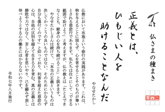 仏教において布施という修行の実践があります。これは、物を与えることに限らず、心を寄せることそのものが尊いとされる慈悲行であります。私たちは往々にして「できる範囲で助けよう」と考えますが、仏の教えは「たとえできなくとも、献身の心を持ち続けること」と説きます。やなせたかしさんは続けて、「本当の正義というものは決してかっこうの良いものではない、そのためにかならず自分も傷付くのです」と仰っており、利害を超えた慈悲の心は、自他の区別を越えて生きる力を育む。真の正義とは勝敗や力ではなく、苦しむ者を思いやり、己を顧みず差し伸べようとする心の働きにほかならないのです。