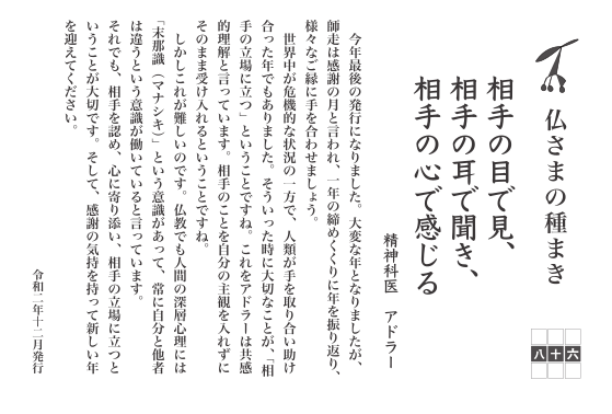 今年最後の発行になりました。大変な年となりましたが、師走は感謝の月と言われ、一年の締めくくりに年を振り返り、様々なご縁に手を合わせましょう。世界中が危機的な状況の一方で、人類が手を取り合い助け合った年でもありました。そういった時に大切なことが、「相手の立場に立つ」ということですね。これをアドラーは共感的理解と言っています。相手のことを自分の主観を入れずにそのまま受け入れるということですね。しかしこれが難しいのです。仏教でも人間の深層心理には「末那識(マナシキ)」という意識があって、常に自分と他者は違うという意識が働いていると言っています。それでも、相手を認め、心に寄り添い、相手の立場に立つということが大切です。そして、感謝の気持ちを持って新しい年を迎えてください。