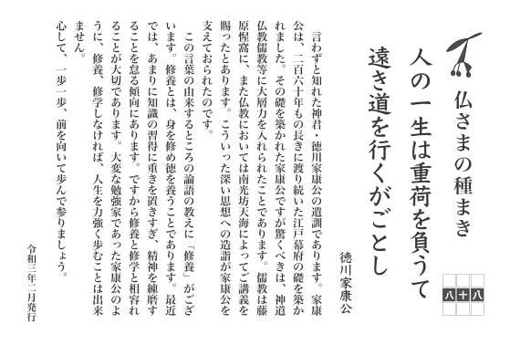 言わずと知れた神君・徳川家康公の遺訓であります。家康公は、二百六十年もの長きに渡り続いた江戸幕府の礎を築かれました。その礎を築かれた家康公ですが驚くべきは、神道仏教儒教等に大層力を入れられたことであります。儒教は藤原惺窩に、また仏教においては南光坊天海によってご講義を賜ったとあります。こういった深い思想への造詣が家康公を支えておられたのです。この言葉の由来するところの論語の教えに「修養」がございます。修養とは、身を修め徳を養うことであります。最近では、あまりに知識の習得に重きを置きすぎ、精神を練磨することを怠る傾向にあります。ですから修養と修学と相容れることが大切であります。大変な勉強家であった家康公のように、修養、修学しなければ、人生を力強く歩むことは出来ません。心して、一歩一歩、前を向いて歩んで参りましょう。