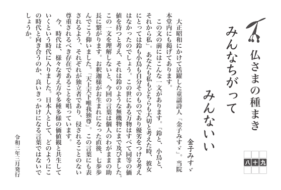 大正昭和にかけて活躍した童謡詩人「金子みすゞ」。当院本堂内にも掲げてあります。この文の前にはこんな一文があります。「鈴と、小鳥と、それから私」。あなたも私もどちらも大切と考えた時、彼女にとっては鈴も小鳥も自分そのものであり優劣をつける考えはなかったのでしょう。この世にある万物はすべて同等の価値を持つと考え、それは鈴のような無機物にまで及びました。この一文を理解しないと、今回の言葉は個人のわがままの助長に繋がります。お釈迦様がお生まれになった直後、七歩歩んでこう仰いました。「天上天下唯我独尊」。この言葉にも表されるよう、それぞれが独立者であり、侵されることのない尊重されるべき存在であることを唱っています。今、時代は、様々な考え方や多種多様の価値観と共生していくという時代に入りました。日本人として、どのようにこの時代と向き合うのか、良いきっかけになる言葉ではないでしょうか。