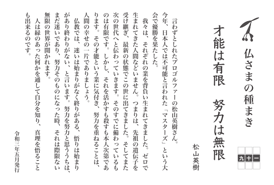 言わずと知れたプロゴルファーの松山英樹さん。今年、日本人では不可能と言われた「マスターズ」という大会で優勝を果たした。我々は、それぞれの業を背負い生まれてきました。ゼロで生まれてきた人間などいません。つまりは、先祖の遺伝子を受け継ぎ、最新の状態でこの世に出てきました。そしてまた次の世代へと伝わっていきます。そのすでに備わっているものは有限です。しかし、それを活かすも殺すも本人次第であります。その才能という業に気付き、努力を重ねることは、人間の幸せの一片でありましょう。仏教では、迷いは始まりがなく終わりがある、悟りは始まりがあり終わりがない、と言います。努力を努力と思ううちは、まだ迷いであり、努力そのものになった時、それは際限ない無限の世界が開かれます。人は縁のあった何かを通して自分を知り、真理を悟ることも出来るのです。