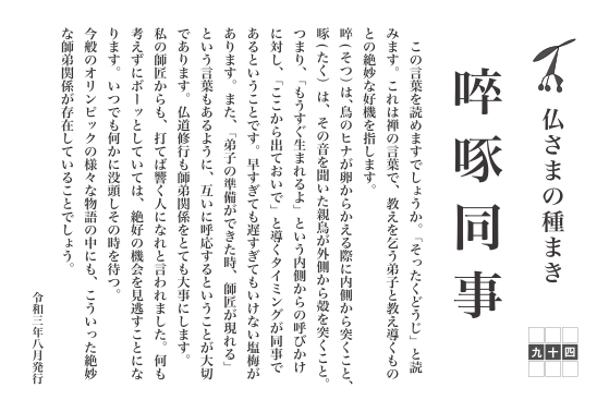 この言葉を読めますでしょうか。「そったくどうじ」と読みます。これは禅の言葉で、教えを乞う弟子と教え導くものとの絶妙な好機を指します。啐(そつ)は、鳥のヒナが卵からかえる際に内側から突くこと、啄(たく)は、その音を聞いた親鳥が外側から殻を突くこと。つまり、「もうすぐ生まれるよ」という内側からの呼びかけに対し、「ここから出ておいで」と導くタイミングが同時であるということです。早すぎても遅すぎてもいけない塩梅があります。また、「弟子の準備ができた時、師匠が現れる」という言葉もあるように、互いに呼応するということが大切であります。仏道修行も師弟関係をとても大事にします。私の師匠からも、打てば響く人になれと言われました。何も考えずにボーッとしていては、絶好の機会を見逃すことになります。いつでも何かに没頭しその時を待つ。今般のオリンピックの様々な物語の中にも、こういった絶妙な師弟関係が存在していることでしょう。