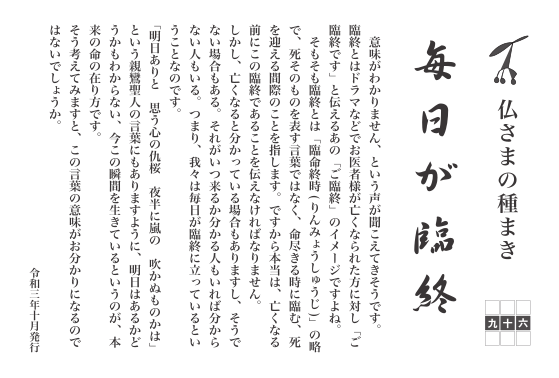 意味がわかりません、という声が聞こえてきそうです。臨終とはドラマなどでお医者様が亡くなられた方に対し「ご臨終です」と伝えるあの「ご臨終」のイメージですよね。そもそも臨終とは「臨命終時(りんみょうしゅうじ)」の略で、死そのものを表す言葉ではなく、命尽きる時に臨む、死を迎える間際のことを指します。ですから本当は、亡くなる前にこの臨終であることを伝えなければなりません。しかし、亡くなると分かっている場合もありますし、そうでない場合もある。それがいつ来るか分かる人もいれば分からない人もいる。つまり、我々は毎日が臨終に立っているということなのです。「明日ありと 思う心の仇桜 夜半に嵐の 吹かぬものかは」という親鸞聖人の言葉にもありますように、明日はあるかどうかはわからない、今この瞬間を生きているというのが、本来の命の在り方です。そう考えてみますと、この言葉の意味がお分かりになるのではないでしょうか。