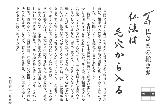 当院にはよく巡礼の方々がお参りに来られます。コロナ以前は、観光バスに乗って数十名の団体も珍しくありませんでした。その際によくお尋ねすることがあります。「皆様 本日はようこそ本蔵院へお参りくださいました。今日は何カ寺ほど参られましたか。そこのご住職様はどんなお話をしてくださいましたか。」と。するとほとんど覚えていらっしゃいません(笑)。続けて、「まあそんなものです。難しいお話をしても何も残りはしません。でも心配せんでよろしいよ。仏法は毛穴から入ると言ってね。昔、お説法が始まるとすぐ寝てしまう婆ちゃんがいらっしゃた。お婆さん、せっかくお寺に来ておるのにもったいなかね、と。ところがそのお婆さんは、大丈夫や仏法は耳から入るのと違う、毛穴から入るんや」とまあ冗談のような話がありました。しかし本当にその通りで、その場に身を置くということが大切で、香のかおり、読経の音、荘厳された世界、すべてが仏法であります。どうぞ、お寺に身を置き、その世界に浸り、そのままお持ち帰りください。