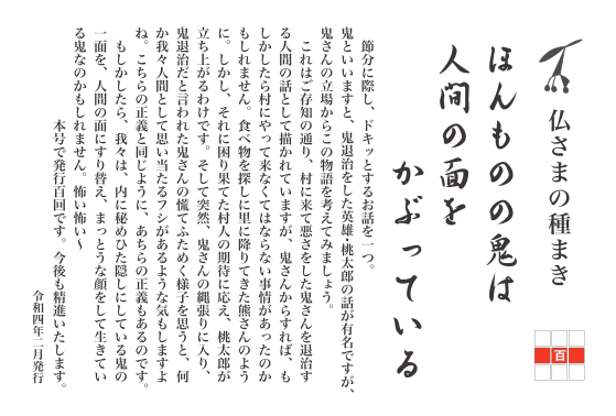 節分に際し、ドキッとするお話を一つ。鬼といいますと、鬼退治をした英雄・桃太郎の話が有名ですが、鬼さんの立場からこの物語を考えてみましょう。これはご存知の通り、村に来て悪さをした鬼さんを退治する人間の話として描かれていますが、鬼さんからすれば、もしかしたら村にやって来なくてはならない事情があったのかもしれません。食べ物を探しに里に降りてきた熊さんのように。しかし、それに困り果てた村人の期待に応え、桃太郎が立ち上がるわけです。そして突然、鬼さんの縄張りに入り、鬼退治だと言われた鬼さんの慌てふためく様子を思うと、何か我々人間として思い当たるフシがあるような気もしますよね。こちらの正義と同じように、あちらの正義もあるのです。もしかしたら、我々は、内に秘めひた隠しにしている鬼の一面を、人間の面にすり替え、まっとうな顔をして生きている鬼なのかもしれません。怖い怖い~本号で発行百回です。今後も精進いたします。
