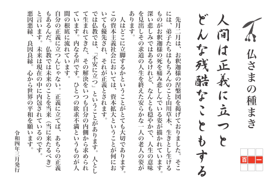 先月二月は、お釈迦様の涅槃図を掲げておりました。そこには、弟子たちはもちろんのこと山川草木、生きとし生けるものがお釈迦様の死を痛み悲しんでいる姿が描かれています。深い悲しみではあるけれど、なんとも穏やかで、人生の意味を見出しその求道の人生を終えた安らかな一人の老人の姿があります。人はどこに立脚するかということがとても大切であります。この資本主義社会においては、資本拡大ということが何においても優先され、それが正義とされます。では仏教では、「不安に立つ」ということがあります。人として生まれてきた、その解決をいつも自分の内側から求められています。内なる声です。ひとつの欲求不満というものが人間の根底に流れています。自分の正義に立つんじゃない。正義に立てば、あちらの正義もあるんだ。仏教では未来のことを当来(当に来たるべき)と言います。未来は現在の中に内包されているのです。悪因悪縁、良因良縁。心から世界の平和を願います。