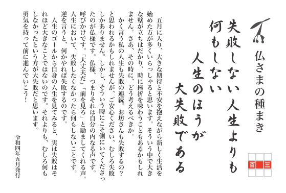 五月に入り、大きな期待と不安を抱えながら新しく生活を始めた方が多くいらっしゃると思います。そういう中で大きな壁が立ちはだかり、時に挫折を味わうこともあるかもしれません。さあ、その時に、どう考えるべきか。かく言う私の人生も失敗の連続。お坊さんも失敗するの?と思われるかもしれませんが、ご安心ください、むしろ失敗しかありません。しかし、そういう時にこそ側にいてくださったのが仏様です。仏様、つまりそれは自分の内なる声です。呼びかけです。「大丈夫だ」「前を見ろ」と励ましてくれる声。人生において、失敗したくなかったら何もしないことです。逆を言うと、何かやれば失敗するのです。人生のゴールから自身の人生を見てみると、実は失敗はそれほど大きなことではないのです。それよりも、むしろ何もしなかったという方が大失敗だと思います。勇気を持って前に進んでいこう!